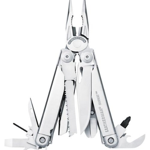 Leatherman Surge Stainless Steel Multi - Tool, built for tough jobs and the hands that do them. Handyman powerhouse! The Surge Multi-Tool features Leatherman's largest pliers, longest blades and easiest locks. A unique blade exchanger, large and small-bit drivers and 4 outside-opening blades give you quick access to the tools you use most. It's loaded with all this: 420HC clip point knife; 420HC sheepsfoot serrated knife; Needlenose pliers; Regular pliers; Wire cutters; Hard wire cutters; Stranded-wire cutters; Wire stripper; Electrical crimper; 5/16" screwdriver; Large bit driver; Small bit driver; Scissors; Wood / metal file; Diamond-coated file; Saw; Bottle opener; Can opener; 9"/22 cm ruler; Awl with thread loop; Blade exchanger; INLCUDED BITS: Phillips and flat tip eyeglass screwdriver bit; Phillips #1-2; 3/16" bit. Features: Stainless steel handles; Stainless steel body; Outside-accessible blades for one-handed opening; All locking blades and tools; Lanyard ring; Sheath included. 25-year warranty. 4 1/2" l. closed. Weighs 12 1/2 ozs. Order yours today! WARNING: You must be 18 or older to purchase Cutlery. Cutlery cannot be shipped to Marin, Napa, Ventura and Yolo counties, CA; D.C.; MA; Miami-Dade & Sarasota counties, FL or Puerto Rico. Please check your State, County and City laws for restrictions before ordering Cutlery. Leatherman Surge Stainless Steel Multi-Tool